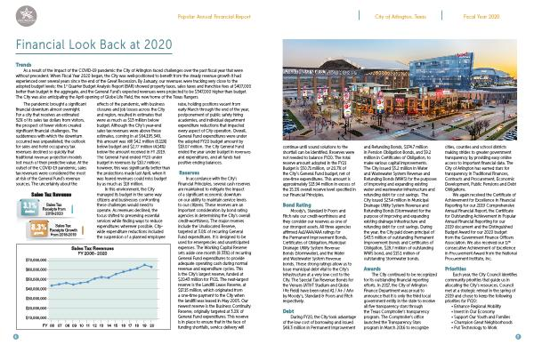 As a result of the impact of the COVID-19 pandemic the City of Arlington faced challenges over the past fiscal year that were without precedent . When Fiscal Year 2020 began , the City was well-positioned to benefit from the steady revenue growth it had experienced over several years since the end of the Great Recession . By January , our revenues were tracking very close to the adopted budget levels ; the 1 st Quarter Budget Analysis Report ( BAR ) showed property taxes , sales taxes and franchise fees at $ 407,000 better than budget in the aggregate , and the General Fund ’ s expected revenues were projected to be $ 347,000 higher than budget . The City was also anticipating the April opening of Globe Life Field , the new home of the Texas Rangers .