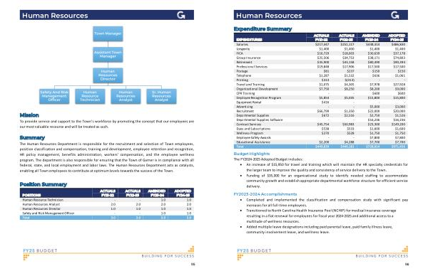 The Human Resources Department is responsible for the recruitment and selection of Town employees , position classification and compensation , training and development , employee retention and recognition , HR policy management , benefits administration , workers ' compensation , and the employee wellness program . The department is also responsible for ensuring that the Town of Garner is in compliance with all federal , state , and local employment and labor laws . The Human Resources Department acts as catalysts , enabling all Town employees to contribute at optimum levels towards the success of the Town .