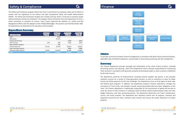 The Safety and Compliance program reflects the Town ’ s commitment to employee safety and its efforts to comply with the regulations of the federal and state Occupational Safety and Health Administration ( OSHA ). The Safety and Compliance program also includes training , which is necessary to maintain proper safety procedures among our employees . The program utilizes personnel from each department to form a safety committee to complete its mission . Town Council approved the addition of a Safety and Risk Management Officer with the adoption of the FY2023-2024 Budget . The position was filled November 2023 . All expenditures are dedicated to the operations of the program .