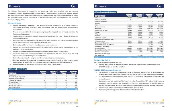 � Provide Finance Department staff with the level of tools , resources , and professional development critical to their success in achieving established work plans . � Deliver value-added services in a friendly manner to our customers . � Manage cash balances in accordance with financial policies to protect capital , provide liquidity , and maximize investment earnings . � Prepare accurate payroll and provide payroll customer service to over 200 employees . � Obtain the best value for the commodities and services that the Town needs using the most efficient process and following NC General Statutes . � Review Town contracts for compliance with financial policies in a timely manner . � Generate broad participation and competition among potential vendors while ensuring equal opportunity to all qualified vendors and contractors wishing to compete for Town business . � Maintain an accurate and up-to-date inventory of the Town ’ s fixed assets .