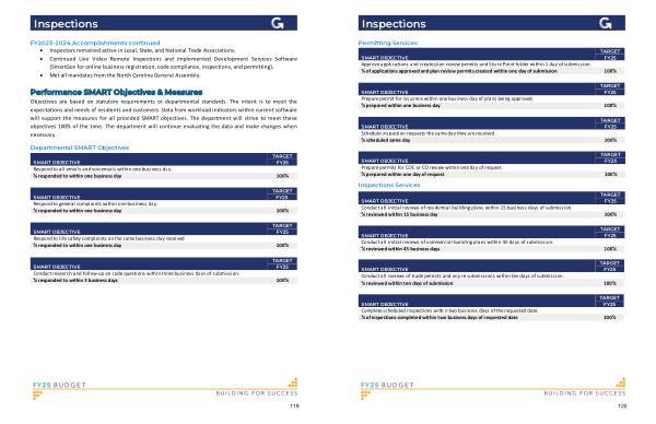 Complete scheduled inspections within two business days of the requested date . % of inspections completed within two business days of requested date 100 %