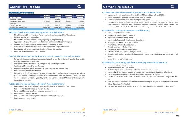 FY2023-2024 Hazardous Materials Program Accomplishments � Experienced an increase in hazardous condition ( 400 series ) type calls by 27.69 %. � Coded roughly 70 % of hazmat calls as natural gas or LPG leaks . � Completed required annual six hour training for employees . � Participated in Senior Officials Workshop for All-Hazards Preparedness hosted on-site by Texas A & M Engineering Extension Service in conjunction with Garner Police Department , Garner Town Leadership , Wake County EMS , NC State Bureau of Investigation , and the Federal Railroad .
