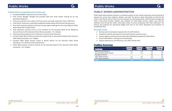 Public Works Administration provides a centralized location for the receipt , processing , and monitoring of requests for service from residents , officials , and staff . The division relays information to and from the crews in the field as well as tracks all service requests for reporting purposes . Administration manages the Town ’ s solid waste contract , registers new residents for solid waste services , repairs carts used for collection , and surveys the Town ’ s solid waste routes to ensure compliance with Town ordinances . The division also prepares the operational budget each year for the entire department and maintains all accreditation files .