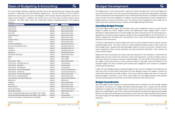 Legal Services General General Government Town Manager General General Government Town Clerk General General Government Human Resources General General Government Safety General General Government Communications General General Government Finance General General Government Economic Development General Development Services Economic Development Partners General Development Services Planning General Development Services Inspections General Development Services Engineering General Development Services Information Technology General General Government Police General Public Safety Fire General Public Safety Public Works - Admin General General Government Public Works - Street Maintenance General Transportation Public Works - Powell Bill General Transportation Public Works - Snow Removal General Transportation Public Works - Grounds Management General Cultural & Recreational Public Works - Solid Waste General Solid Waste & Recycling Public Works - Facilities Management General General Government Public Works - Fleet Management General General Government Parks , Recreation , & Cultural Resources General Cultural & Recreational Debt Service General Debt Service Transfers General General Government Retirement General General Government Town Insurance General General Government Subsidized Programs General Cultural & Recreational Office Administration General General Government Vehicle and Equipment Replacement Team ( VERT ) - Public Safety General Public Safety Vehicle and Equipment Replacement Team ( VERT ) - Public Works General Transportation Public Facilities Repair and Maintenance Team ( PFRM ) General General Government