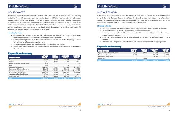 Solid Waste administers and maintains the contract for the collection and disposal of refuse and recycling materials . Town-wide contracted collection service began in 1990 . Services currently offered include weekly curbside collection of garbage , trash , and prepared yard waste ; bi-weekly curbside collection of recyclables ; periodic “ unprepared ” trash and yard waste collection ; and collection of leaves . There are no dedicated Town employees assigned to the Solid Waste division . When needed , the Solid Waste division utilizes employees from other areas of the Public Works Department to complete their work . All expenditures are dedicated to the operations of the program .