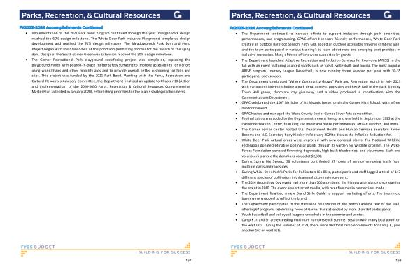 � The Garner Recreational Park playground resurfacing project was completed , replacing the playground mulch with poured-in-place rubber safety surfacing to improve accessibility for visitors using wheelchairs and other mobility aids and to provide overall better cushioning for falls and slips . This project was funded by the 2021 Park Bond . Working with the Parks , Recreation and Cultural Resources Advisory Committee , the Department finalized an update to Chapter 10 ( Action and Implementation ) of the 2020-2030 Parks , Recreation & Cultural Resources Comprehensive Master Plan ( adopted in January 2020 ), establishing priorities for the plan ’ s strategy / action items .