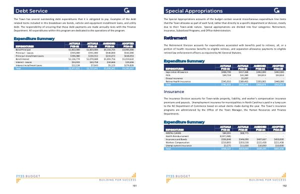 The Special Appropriations accounts of the budget contain several miscellaneous expenditure line items that the Town allocates as part of each fund , rather than directly to a specific department or division , mostly due to their Town-wide nature . Special appropriations are divided into four categories : Retirement , Insurance , Subsidized Programs , and Office Administration .