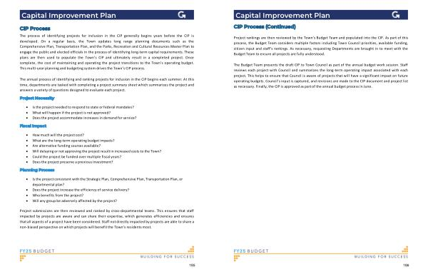 Project rankings are then reviewed by the Town ’ s Budget Team and populated into the CIP . As part of this process , the Budget Team considers multiple factors including Town Council priorities , available funding , citizen input and staff ’ s rankings . As necessary , requesting Departments are brought in to meet with the Budget Team to ensure all projects are fully understood .