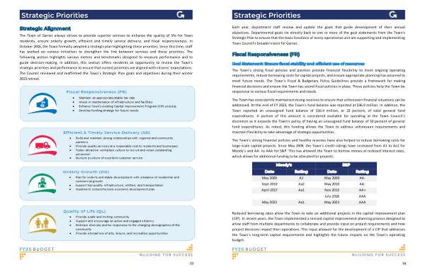 Goal Statement : Ensure fiscal stability and efficient use of resources The Town ’ s strong fiscal policies and position provide financial flexibility to meet ongoing operating requirements , reduce borrowing costs for capital projects , and ensure appropriate planning has occurred to meet future needs . The Town ’ s Fiscal & Budgetary Policy Guidelines provide a framework for making financial decisions and ensure the Town has sound fiscal policies in place . These policies help the Town be responsive to various fiscal requirements and needs .