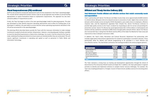 In addition , the Town ’ s Parks , Recreation and Cultural Resources Department has partnerships with multiple organizations that enhance opportunities for residents to participate in recreation activities . These partnerships allow for athletic and cultural programming to be provided in a more efficient and cost-effective manner . The chart below summarizes the funding provided to the various program partners :