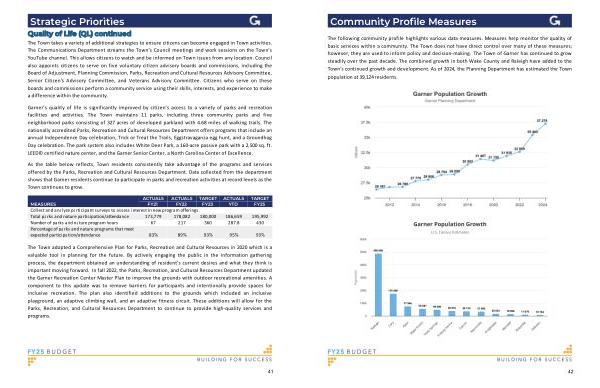 The following community profile highlights various data measures . Measures help monitor the quality of basic services within a community . The Town does not have direct control over many of these measures ; however , they are used to inform policy and decision-making . The Town of Garner has continued to grow steadily over the past decade . The combined growth in both Wake County and Raleigh have added to the Town ' s continued growth and development . As of 2024 , the Planning Department has estimated the Town