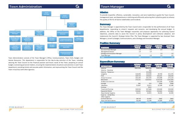 Town Administration consists of the Town Manager ’ s Office , Communications , Town Clerk , Budget , and Human Resources . This department is responsible for the day-to-day activities of the Town , including advising the Town Council on the financial position and future needs of the Town , preparing an annual budget , overseeing personnel matters , ensuring the implementation of policies and activities in each Town department , providing timely and accurate public information , and representing the Town Council and the Town in business with other agencies .