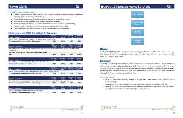 The Budget and Management Services Office analyzes revenue and expenditures , gathers , and tracks performance management data , and performs both short-term and long-term financial analysis to ensure the Town is in accordance with its overall strategic plan . Using data , planning , and forecasting tools , Budget and Management Services collaborates with Town departments to ensure that the Town is financially stable , efficient , and providing high-quality services .