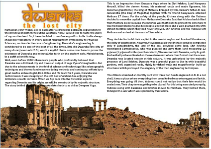 Namaskar, your friend, Soc is back after a strenuous Bermuda exploration in the previous month in its subtle weather. Now, I would like to taste the glory of my motherland. So, I have decided to confine myself to India. India always shows her versatility in every aspect ranging from Philosophy to Physical Sciences, so does in the case of engineering. Dwaraka's engineering is considered to be one of the best of all the times. But, did Dwaraka (the city of many doors) ever exist? Or, was it a myth? I have come over here to prove the existence of Dwaraka and reinstall the faith on the ancient epic, Mahabharata, in a swift scientific way.