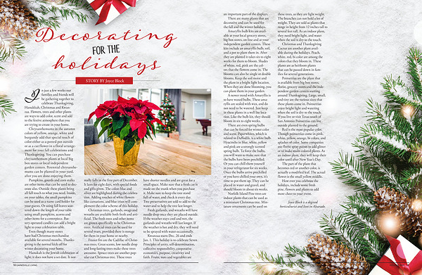 I n just a few weeks our families and friends will be gathering together to celebrate Thanksgiving, Hanukkah, Christmas and Kwanzaa. Flowers, trees and other plants are ways to add color, scent and add to the festive atmosphere that you are trying to create in your home.