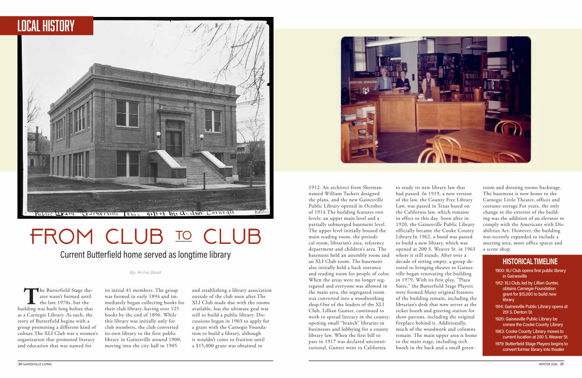 to study its new library law that had passed. In 1919, a new version of the law, the County Free Library Law, was passed in Texas based on the California law, which remains in effect to this day. Soon after in 1920, the Gainesville Public Library officially became the Cooke County Library. In 1962, a bond was passed to build a new library, which was opened at 200 S. Weaver St. in 1963 where it still stands. After over a decade of sitting empty, a group devoted to bringing theater to Gainesville began renovating the building in 1979. With its first play,“ Plaza Suite,” the Butterfield Stage Players were formed. Many original features of the building remain, including the librarian’ s desk that now serves as the ticket booth and greeting station for show patrons, including the original fireplace behind it. Additionally, much of the woodwork and columns remain. The main upper area is home to the main stage, including tech booth in the back and a small greenroom and dressing rooms backstage. The basement is now home to the Carnegie Little Theater, offices and costume storage. For years, the only change to the exterior of the building was the addition of an elevator to comply with the Americans with Disabilities Act. However, the building was recently expanded to include a meeting area, more office spaces and a scene shop.