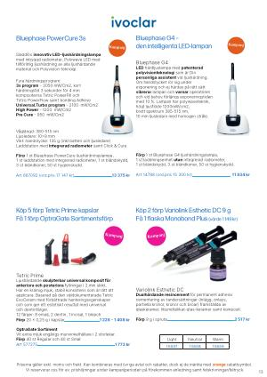 Förp 1 st Bluephase PowerCure ljushärdningslampa , 1 st laddstation med integrerad radiometer , 1 st bländskydd , 3 st bländkoner , 50 st hygienskydd .