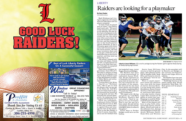 The Raiders have two new opponents on the schedule— Doddridge County in the season opener Aug. 29 and Greenbrier West Sept. 12. Both games will be played at home.