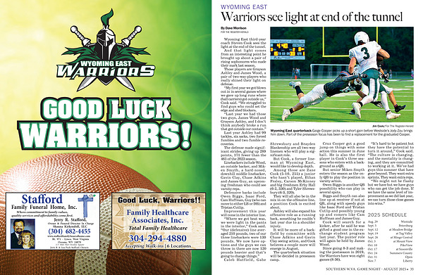 Wyoming East quarterback Gaige Cooper picks up a short gain before Westside’ s Jody Zou brings him down. Part of the preseason focus has been to find a replacement for the graduated Cooper.