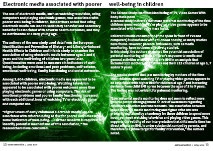 In this study, the authors examined the potential association of parental monitoring of their children's exposure to media and general activities with the children's BMI in an analysis that included 112 mothers, 103 fathers and their 213 children at age 5, 7 and/or 9 years.