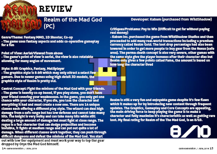 Realm is still a very fun and enjoyable game despite it's few flaws which it makes up for by introducing new content through frequent updates. The Graphics, Gameplay and Core Concepts are appealing, the main driving force to keep playing the game is to make a character and fully maximize it's characterisitic as well as getting rare loot. My final rating for Realm of the The Mad God, is an 8/10.