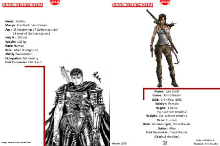 Name: Lara Croft Game: Tomb Raider DOB: 14th Feb, 1992 Gender: Female Height: 164 cm( Varies from timeline)