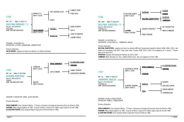OPEN CHIMENTO : Gran Campeón Macho , 1 º Premio y Campeón de Categoría Exposición Rural de Palermo 2005 . CHUSMA : Mejor yegua jugadora en 1995 - Copa de la Reina y Copa de Oro , Mejor yegua Copa de Oro año 1996 . ELLERSTINA PÍCARO : Gran Campeón Macho Exposición Rural de Palermo 1998 .