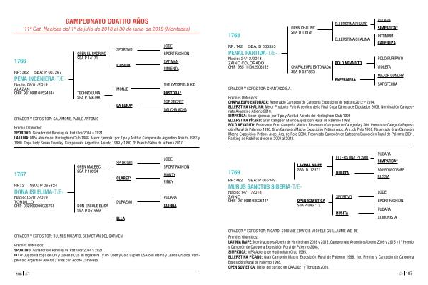 CRIADOR Y EXPOSITOR : RICARD , CORINNE EDWIGIE MICHELE GUILLAUME WE . DE Premios Obtenidos : LAVINIA NAIPE : Nominaciones Abierto de Hurlingham 2008 y 2015 , Campeonato Argentino Abierto 2009 y 2015 y 1 º Premio y Campeón de Categoría Exposición Rural de Palermo 2008 . SIMPÁTICA : MPA Abierto de Hurlingham Club 1995 . ELLERSTINA PÍCARO : Gran Campeón Macho Exposición Rural de Palermo 1998 . 1er . Premio y Campeón de Categoría Exposición Rural de Palermo 1998 . OPEN SOVIETICA : Mejor del partido en CAA 2021 y Tortugas 2020 .