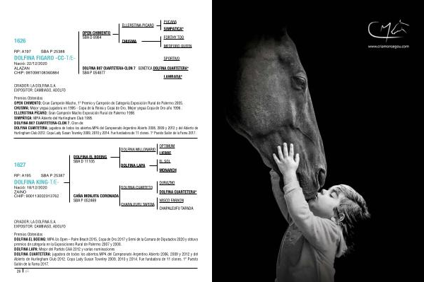 Premios Obtenidos : OPEN CHIMENTO : Gran Campeón Macho , 1 º Premio y Campeón de Categoría Exposición Rural de Palermo 2005 . CHUSMA : Mejor yegua jugadora en 1995 - Copa de la Reina y Copa de Oro , Mejor yegua Copa de Oro año 1996 . ELLERSTINA PÍCARO : Gran Campeón Macho Exposición Rural de Palermo 1998 . SIMPÁTICA : MPA Abierto del Hurlingham Club 1995 . DOLFINA B07 CUARTETERA-CLON 7 . Clon de : DOLFINA CUARTETERA : jugadora de todos los abiertos . MPA del Campeonato Argentino Abierto 2006 , 2009 y 2012 y del Abierto de Hurlingham Club 2012 . Copa Lady Susan Townley 2009 , 2010 y 2014 . Fue fundadora de 11 clones . 1 º Puesto Salón de la Fama 2017 .
