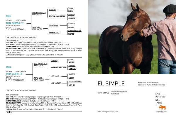 Premios Obtenidos : TAITA FACIL : Gran Campeón Hembra y Campeón Categoría Exposición Rural Palermo 2018 . OPEN SO EASY : Obtuvo nominaciones CAA 2015 – 20216 y Abierto de Hurlingham 2013,2015 y 2016 . ELLERSTINA PICARO : Gran Campeón Macho Exposición Rural Palermo 1998 . DOLFINA CUARTETERA : jugadora de todos los abiertos . MPA del Campeonato Argentino Abierto 2006 , 2009 y 2012 y del Abierto de Hurlingham Club 2012 . Copa Lady Susan Townley 2009 , 2010 y 2014 . Fue fundadora de 11 clones . 1 º Puesto Salón de la Fama 2017 . LAMBADA : Mejor Ejemplar por Tipo y Aptitud Abierto Asoc . Arg . de Jugadores de Polo 1999 .