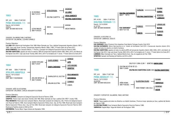 Premios Obtenidos : CHAPA GEMINIS : Campeón de Categoría Exposición Rural de Palermo 2006 . CHISPITA : Premio Copa Lady Susan Townley CAA 1993 , Mejor ejemplar por tipo y aptitud CAA 1993 Y Jockey 1992 . POLO NEVADITO : Reservado Gran Campeón Macho , Reservado Campeón de Categoría y 2do . Premio de Categoría Exposición Rural de Palermo 1996 . Gran Campeón Macho Exposición Petisos Asoc . Arg . de Polo 1998 . Reservado Gran Campeón Macho Exposición Petisos Asoc . Arg . de Polo 2000 . Reservado Campeón de Categoría Exposición Rural de Palermo 2001 . Ranking de Padrillos desde el 2003 al 2012 . ENFERMERA : Premio Mejor Yegua Cámara de Diputados 1994 .