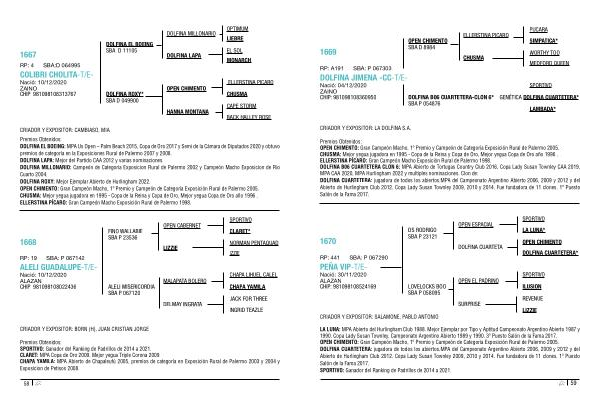 Premios Obtenidos : DOLFINA EL BOEING : MPA Us Open – Palm Beach 2015 , Copa de Oro 2017 y Semi de la Cámara de Diputados 2020 y obtuvo premios de categoría en la Exposiciones Rural de Palermo 2007 y 2008 . DOLFINA LAPA : Mejor del Partido CAA 2012 y varias nominaciones . DOLFINA MILLONARIO : Campeón de Categoria Exposicion Rural de Palermo 2002 y Campeón Macho Exposicion de Rio Cuarto 2004 . DOLFINA ROXY : Mejor Ejemplar Abierto de Hurlingham 2022 . OPEN CHIMENTO : Gran Campeón Macho , 1 º Premio y Campeón de Categoría Exposición Rural de Palermo 2005 . CHUSMA : Mejor yegua jugadora en 1995 - Copa de la Reina y Copa de Oro , Mejor yegua Copa de Oro año 1996 . ELLERSTINA PÍCARO : Gran Campeón Macho Exposición Rural de Palermo 1998 .