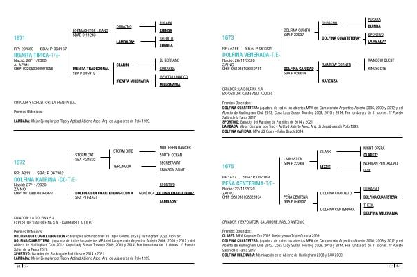 Premios Obtenidos : DOLFINA CUARTETERA : jugadora de todos los abiertos . MPA del Campeonato Argentino Abierto 2006 , 2009 y 2012 y del Abierto de Hurlingham Club 2012 . Copa Lady Susan Townley 2009 , 2010 y 2014 . Fue fundadora de 11 clones . 1 º Puesto Salón de la Fama 2017 . SPORTIVO : Ganador del Ranking de Padrillos de 2014 a 2021 . LAMBADA : Mejor Ejemplar por Tipo y Aptitud Abierto Asoc . Arg . de Jugadores de Polo 1999 . DOLFINA CARIDAD : MPA US Open – Palm Beach 2014 .