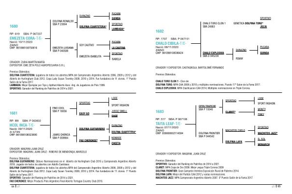 Premios Obtenidos : SPORTIVO : Ganador del Ranking de Padrillos de 2014 a 2021 . CLARET : MPA Copa de Oro 2009 . Mejor yegua Triple Corona 2009 . DOLFINA FRONTIER : Gran Campeón Hembra Exposición Rural de Palermo 2014 . DOLFINA LAPA : Mejor del Partido CAA 2012 y varias nominaciones . MACHITOS JAZZ : MPA Campeonato Argentino Abierto 2007 . 5 º Puesto Salón de la Fama 2017 .