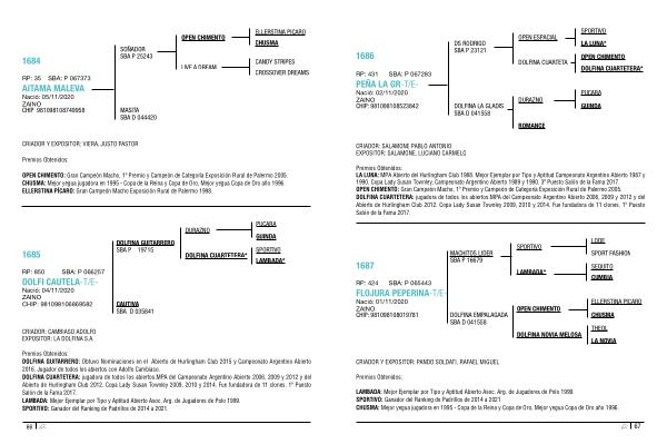 Premios Obtenidos : LA LUNA : MPA Abierto del Hurlingham Club 1988 . Mejor Ejemplar por Tipo y Aptitud Campeonato Argentino Abierto 1987 y 1990 . Copa Lady Susan Townley , Campeonato Argentino Abierto 1989 y 1990 . 3 º Puesto Salón de la Fama 2017 . OPEN CHIMENTO : Gran Campeón Macho , 1 º Premio y Campeón de Categoría Exposición Rural de Palermo 2005 . DOLFINA CUARTETERA : jugadora de todos los abiertos . MPA del Campeonato Argentino Abierto 2006 , 2009 y 2012 y del Abierto de Hurlingham Club 2012 . Copa Lady Susan Townley 2009 , 2010 y 2014 . Fue fundadora de 11 clones . 1 º Puesto Salón de la Fama 2017 .