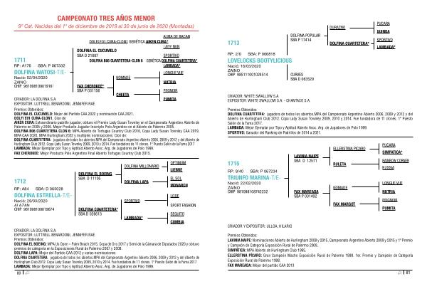 CRIADOR : LA DOLFINA S . A . EXPOSITOR : LUTTRELL BENARDONI , JENNIFER RAE Premios Obtenidos : DOLFINA EL BOEING : MPA Us Open – Palm Beach 2015 , Copa de Oro 2017 y Semi de la Cámara de Diputados 2020 y obtuvo premios de categoría en la Exposiciones Rural de Palermo 2007 y 2008 . DOLFINA LAPA : Mejor del Partido CAA 2012 y varias nominaciones . DOLFINA CUARTETERA : jugadora de todos los abiertos . MPA del Campeonato Argentino Abierto 2006 , 2009 y 2012 y del Abierto de Hurlingham Club 2012 . Copa Lady Susan Townley 2009 , 2010 y 2014 . Fue fundadora de 11 clones . 1 º Puesto Salón de la Fama 2017 . LAMBADA : Mejor Ejemplar por Tipo y Aptitud Abierto Asoc . Arg . de Jugadores de Polo 1999 .