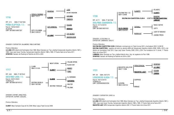 Premios Obtenidos : DOLFINA B04 CUARTETERA CLON 4 : Múltiples nominaciones en Triple Corona 2021 y Hurlingham 2022 . CLON DE : DOLFINA CUARTETERA : jugadora de todos los abiertos . MPA del Campeonato Argentino Abierto 2006 , 2009 y 2012 y del Abierto de Hurlingham Club 2012 . Copa Lady Susan Townley 2009 , 2010 y 2014 . Fue fundadora de 11 clones . 1 º Puesto Salón de la Fama 2017 . LAMBADA : Mejor Ejemplar por Tipo y Aptitud Abierto Asoc . Arg . de Jugadores de Polo 1999 . SPORTIVO : Ganador del Ranking de Padrillos de 2014 a 2021 .