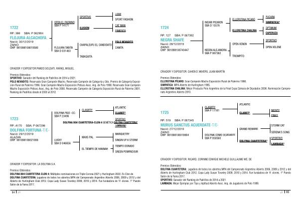 Premios Obtenidos : DOLFINA CUARTETERA : jugadora de todos los abiertos . MPA del Campeonato Argentino Abierto 2006 , 2009 y 2012 y del Abierto de Hurlingham Club 2012 . Copa Lady Susan Townley 2009 , 2010 y 2014 . Fue fundadora de 11 clones . 1 º Puesto Salón de la Fama 2017 . SPORTIVO : Ganador del Ranking de Padrillos de 2014 a 2021 . LAMBADA : Mejor Ejemplar por Tipo y Aptitud Abierto Asoc . Arg . de Jugadores de Polo 1999 .