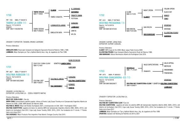 Premios Obtenidos : DOLFINA B07 CUARTETERA CLON 7 Clon de : DOLFINA CUARTETERA : jugadora de todos los abiertos . MPA del Campeonato Argentino Abierto 2006 , 2009 y 2012 y del Abierto de Hurlingham Club 2012 . Copa Lady Susan Townley 2009 , 2010 y 2014 . Fue fundadora de 11 clones . 1 º Puesto Salón de la Fama 2017 . LAMBADA : Mejor Ejemplar por Tipo y Aptitud Abierto Asoc . Arg . de Jugadores de Polo 1999 . SPORTIVO : Ganador del Ranking de Padrillos de 2014 a 2021 .