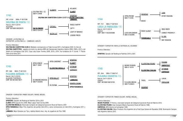 Premios Obtenidos : DOLFINA B04 CUARTETERA CLON 4 : Multiples nominaciones en Triple Corona 2021 y Hurlingham 2022 . Es Clon de : DOLFINA CUARTETERA : jugadora de todos los abiertos . MPA del Campeonato Argentino Abierto 2006 , 2009 y 2012 y del Abierto de Hurlingham Club 2012 . Copa Lady Susan Townley 2009 , 2010 y 2014 . Fue fundadora de 11 clones . 1 º Puesto Salón de la Fama 2017 .