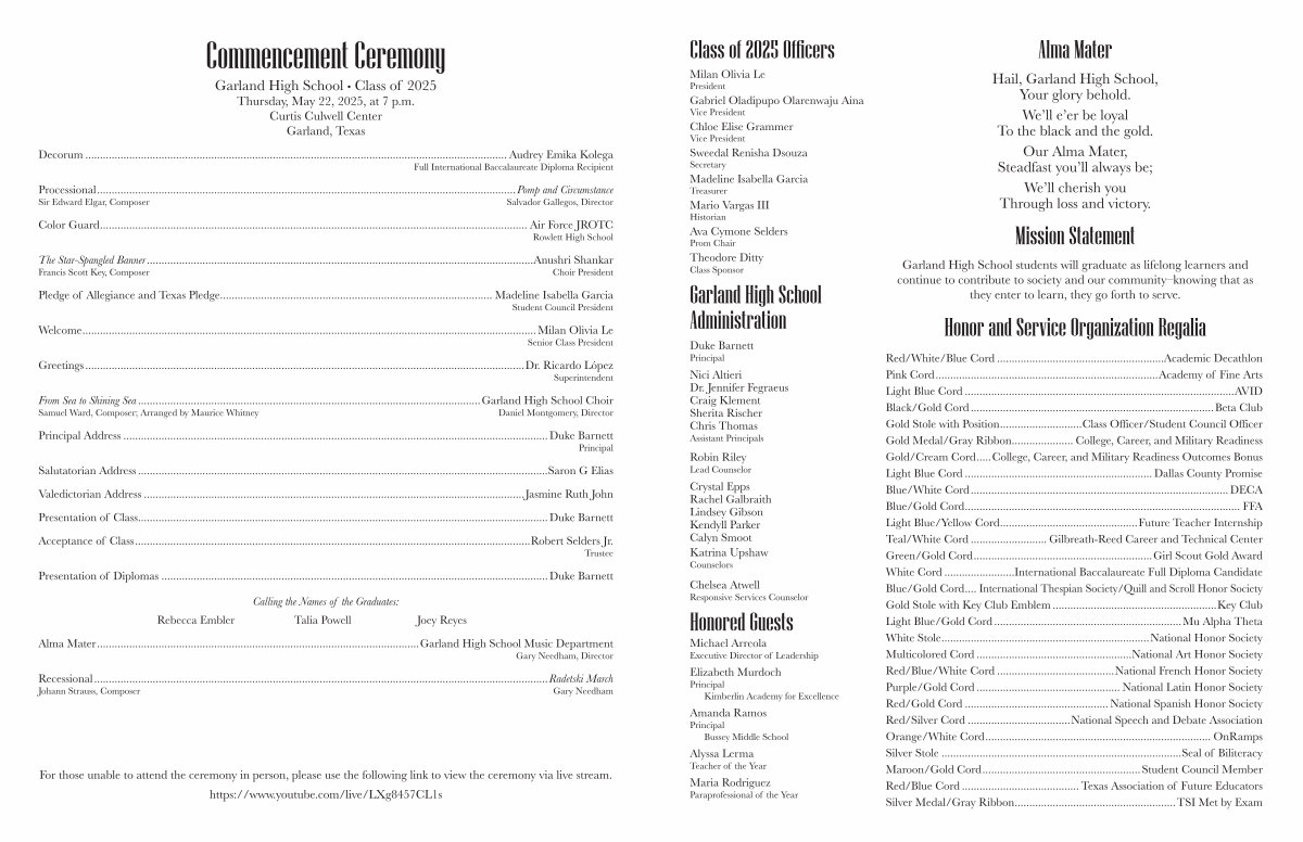 Red / White / Blue Cord.......................................................... Academic Decathlon Pink Cord............................................................................. Academy of Fine Arts Light Blue Cord............................................................................................. AVID Black / Gold Cord.................................................................................... Beta Club Gold Stole with Position............................. Class Officer / Student Council Officer Gold Medal / Gray Ribbon...................... College, Career, and Military Readiness Gold / Cream Cord...... College, Career, and Military Readiness Outcomes Bonus Light Blue Cord................................................................. Dallas County Promise Blue / White Cord......................................................................................... DECA Blue / Gold Cord............................................................................................... FFA Light Blue / Yellow Cord................................................ Future Teacher Internship Teal / White Cord........................... Gilbreath-Reed Career and Technical Center Green / Gold Cord.............................................................. Girl Scout Gold Award White Cord......................... International Baccalaureate Full Diploma Candidate Blue / Gold Cord..... International Thespian Society / Quill and Scroll Honor Society Gold Stole with Key Club Emblem......................................................... Key Club Light Blue / Gold Cord................................................................. Mu Alpha Theta White Stole........................................................................ National Honor Society Multicolored Cord...................................................... National Art Honor Society Red / Blue / White Cord......................................... National French Honor Society Purple / Gold Cord.................................................. National Latin Honor Society Red / Gold Cord.................................................. National Spanish Honor Society Red / Silver Cord.................................... National Speech and Debate Association Orange / White Cord.............................................................................. OnRamps Silver Stole................................................................................... Seal of Biliteracy Maroon / Gold Cord....................................................... Student Council Member Red / Blue Cord......................................... Texas Association of Future Educators Silver Medal / Gray Ribbon........................................................ TSI Met by Exam