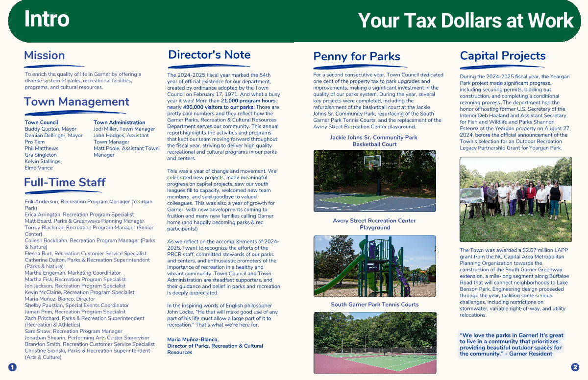 For a second consecutive year, Town Council dedicated one cent of the property tax to park upgrades and improvements, making a significant investment in the quality of our parks system. During the year, several key projects were completed, including the refurbishment of the basketball court at the Jackie Johns Sr. Community Park, resurfacing of the South Garner Park Tennis Courts, and the replacement of the Avery Street Recreation Center playground.
