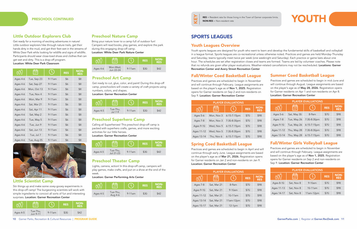 Practices and games are scheduled to begin in November and will continue through February. League assignments are based on the player’ s age as of Nov 1, 2025. Registration opens for Garner residents on Sep 2 and non-residents on Sep 9. Location: Garner Recreation Center