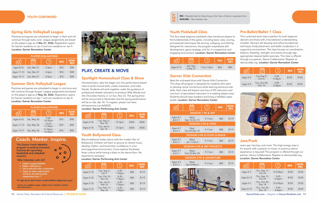 Practices and games are scheduled to begin in mid-June and will continue through August. League assignments are based on the player’ s age as of May 30, 2026. Registration opens for Garner residents on Apr 1 and non-residents on Apr 8. Location: Garner Recreation Center
