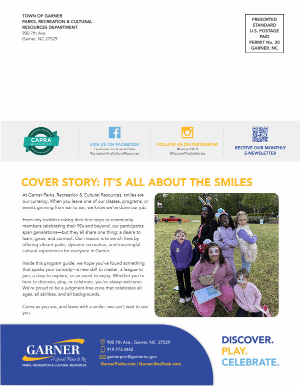At Garner Parks, Recreation & Cultural Resources, smiles are our currency. When you leave one of our classes, programs, or events grinning from ear to ear, we know we’ ve done our job.