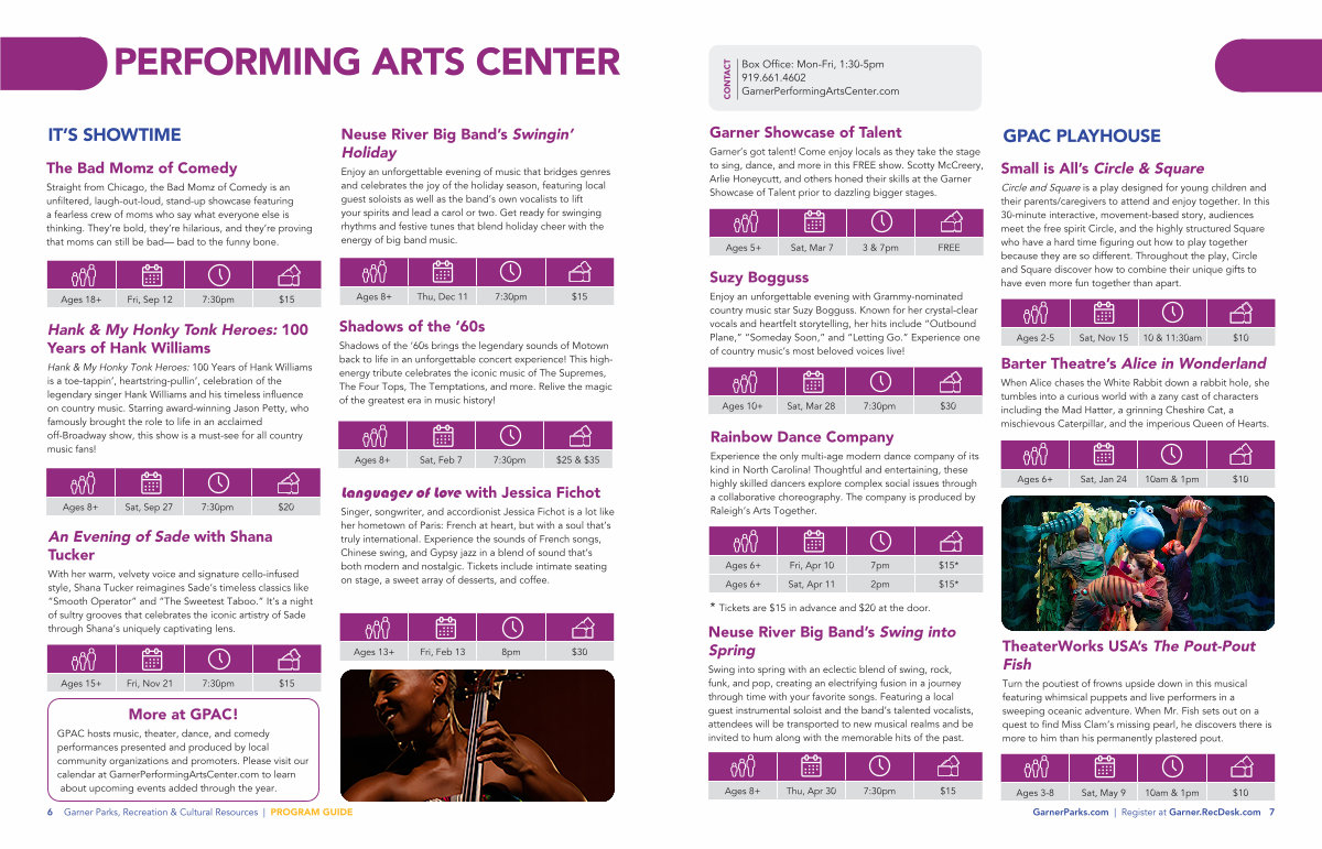 GPAC hosts music, theater, dance, and comedy performances presented and produced by local community organizations and promoters. Please visit our calendar at GarnerPerformingArtsCenter. com to learn about upcoming events added through the year.