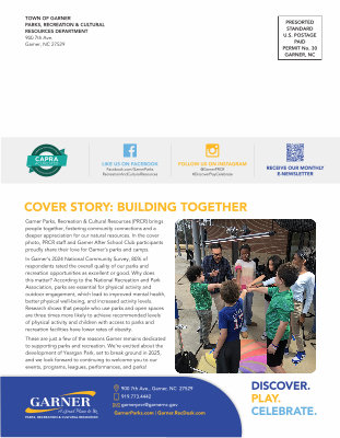 Garner Parks , Recreation & Cultural Resources ( PRCR ) brings people together , fostering community connections and a deeper appreciation for our natural resources . In the cover photo , PRCR staff and Garner After School Club participants proudly share their love for Garner ’ s parks and camps .