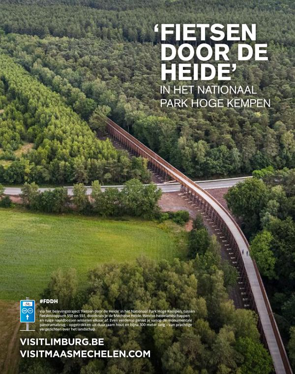 Via het belevingstraject‘ Fietsen door de Heide’ in het Nationaal Park Hoge Kempen, tussen fietsknooppunt 550 en 551, doorkruis je de Mechelse Heide. Weidse heidelandschappen en ruige naaldbossen wisselen elkaar af. Even verderop geniet je vanop de monumentale panoramabrug – opgetrokken uit duurzaam hout en bijna 300 meter lang – van prachtige vergezichten over het landschap.