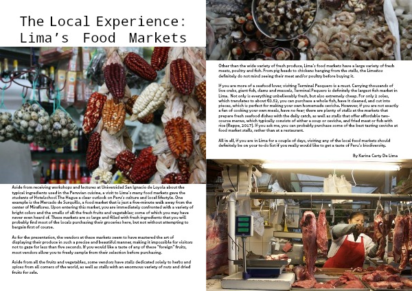 Aside from receiving workshops and lectures at Universidad San Ignacio de Loyola about the typical ingredients used in the Peruvian cuisine, a visit to Lima’s many food markets gave the students of Hotelschool The Hague a clear outlook on Peru’s culture and local lifestyle. One example is the Mercado de Surquillo, a food market that is just a five-minute walk away from the center of Miraflores. Upon entering this market, you are immediately confronted with a variety of bright colors and the smells of all the fresh fruits and vegetables; some of which you may have never even heard of. These markets are so large and filled with fresh ingredients that you will probably find most of the locals purchasing their groceries here, but not without attempting to bargain first of course.