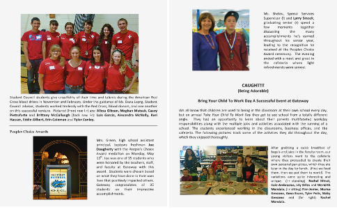 Ms. Shelov, Special Services Supervisor( l) and Larry Smock, graduating senior( r) spend a few moments together discussing the many accomplishments he’ s earned throughout his senior year, leading to the recognition he received at the Peoples Choice Award ceremony. The evening ended with a meet and greet in the cafeteria where light refreshments were served.